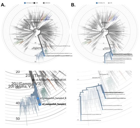 Consensus FASTA files were uploaded to the Nextstrain webapp (Nextclade. Available online: https://clades.nextstrain.org [accessed on 14 December 2021]) to perform phylogenetic analyses [].