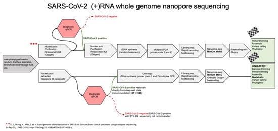 - Li, J.; Wang, H.; Mao, L.; Yu, H.; Yu, X.; Sun, Z.; Qian, X.; Cheng, S.; Chen, S.; Chen, J.; et al. Rapid genomic characterization of SARS-CoV-2 viruses from clinical specimens using nanopore sequencing. Sci. Rep. 2020, 10, 17492. [Google Scholar] [CrossRef] [PubMed]