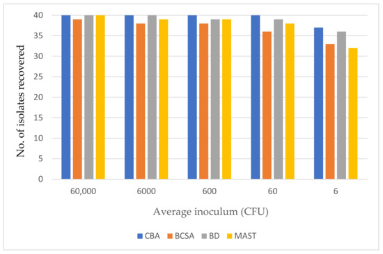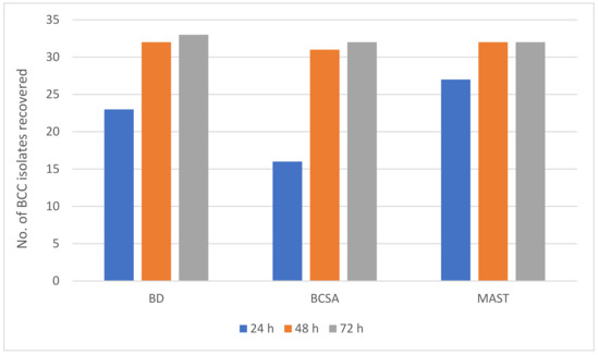 BD offered the best fertility of the three selective agars with all 40 isolates recovered at an inoculum of ≥6000 CFU/spot and 36/40 isolates consistently detected (across three replicates) with a very low inoculum of approx. 6 CFU/spot—only one isolate fewer than detected by Columbia blood agar. The manufacturer’s instructions for MAST recommend an additional 5 days’ incubation at room temperature after 48 h incubation at 35–37 °C. This had no impact on the recovery of pure isolates of BCC at various inocula and had no impact on the isolation of BCC from clinical samples.