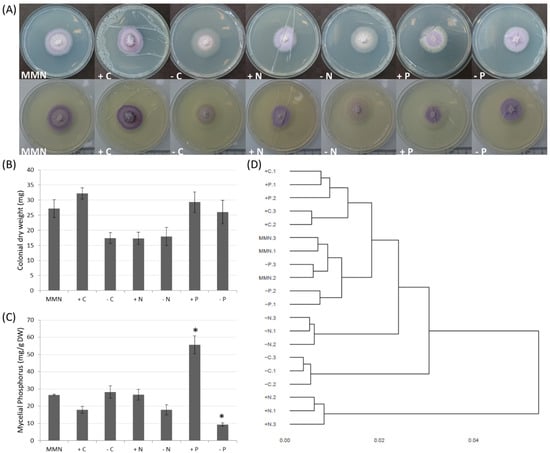 Variations in the composition of the culture medium, i.e., reduced or increased glucose and NH4+ or PO4− concentration, did not result in any significant effect on the growth of L. bicolor. The size of the colonies and colonial dry weight were not significantly different, despite having grown with different nutritional conditions (Figure 1A,B). Nonetheless, mycelia grown on medium adjusted for NH4+ (+N/−N) or with reduced glucose (−C) tended to have lower biomass. Effects on metabolism were clearly visible as changes in colonial pigmentation. Color shades from white to dark violet marked the colonies depending on the composition of the growth medium (Figure 1A). L. bicolor colonies grown on control MMN medium were violet with a small peripheral ring of white mycelium at the edge of the colony. Variations in glucose, NH4+ and PO4− concentration resulted in the local absence of the violet pigment in mycelium grown after the transfer of the colony from control MMN to a different nutritional condition (violet center surrounded by a broad white ring as for reduced glucose (−C) and surplus PO4− (+P); Figure 1A) or in the absence of the pigment with a de-coloration of the MMN pre-cultured mycelium (whole white colony, as for reduced NH4+ (−N); Figure 1A). The accumulation of P within the mycelium changed according to PO4− concentration in the growth medium, with mycelia grown in PO4− surplus showing the highest P accumulation (Figure 1C).