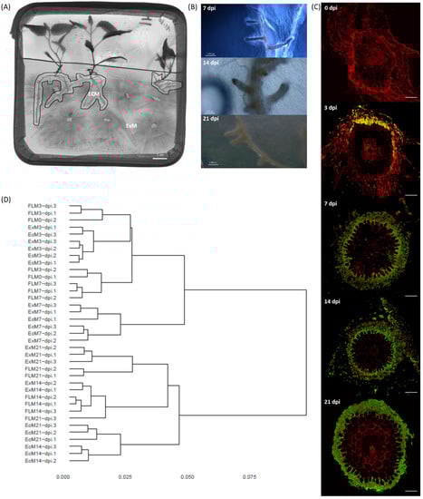 Responses of L. bicolor to P. tremula x alba at different time points post-inoculation. (A) In vitro co-culture of Laccaria and Poplar. Mycelium within a distance of 0.5 cm of a root was considered as ectomycorrhizal (EcM), mycelium at a longer distance as extramatrical (ExM). (B) External view of representative EcM root tips at different time points. (C) Transversal sections of lateral roots at 0, 3, 7, 14 and 21 dpi. Sections were stained with PI and WGA-oregon green to visualize plant (red) and fungal (green) cells, respectively. (D) Hierarchical clusters of overall transcriptomic responses of 37 biological replicates belonging to different stages of EcM development.