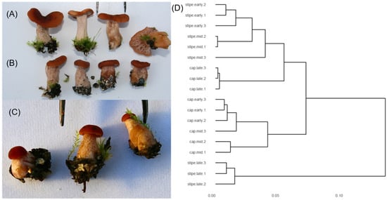 L. bicolor at different stages of basidiocarp development. (A–C) Images of basidiocarp specimen of early (C), medium (B) and late (C) stage development. (D) Hierarchical clusters of overall transcriptomic responses of 12 biological replicates belonging to different stages of basidiocarp development.
