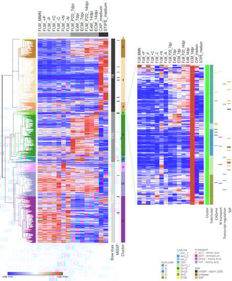 Cluster 3 grouped gene models with maximum expression level when grown on MMN medium (control or nutritionally modified) and was more similar to the P20 group than to the FB group (Figure 4). Within the MMN group, three clusters (9–10–11) were defined. The transcription profile of the gene models included in cluster 9 was characterized by a high expression due to elevated levels of NH4+ in the medium (+N). Cluster 10 and 11 grouped gene models showing a high relative expression in many of the MMN-grown mycelia, which could be almost equally highly expressed in many (cluster 10) or few (cluster 11) P20-related conditions. These clusters contained six SSPs previously annotated as MiSSP (Martin et al., 2008), four of which were induced by mycorrhization (EcM 7 and/or 14 dpi) in this study (Figure S3).