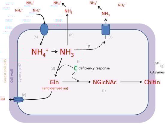 Schematic overview of transcriptional changes and potentially associated cellular responses to excess external NH4+ in L.bicolor. (a) NH4+ likely enters cells using unspecific transporters. In the cytoplasm, a fraction of the NH4+ turns into NH3 due to a pH shift. (b) Gaseous NH3 partially diffuses out of the cell and (c) active transport may contribute to NH3 efflux. In the soil, most NH3 is protonated again. (d) Another part of cellular NH3 is assimilated in gln and derived aa (e), which may be transported out of the cell. (f) Starting from gln, NGlcNAc and subsequently chitin are synthesized. (g) CAZymes assist in cell wall remodeling. SSPs may also contribute to cell wall remodeling or cell–cell communication. (h) Excessive assimilation of NH3 requires carbon and results in a carbon deficiency response. Part of these responses (b,c,e,g) are shared with mycelium in mature mycorrhiza at 14 dpi. gln = glutamine; aa = amino acids; NGlcNAc = N-acetylglucosamine; CAZyme = Carbohydrate Active Enzyme; SSP = small secreted protein.