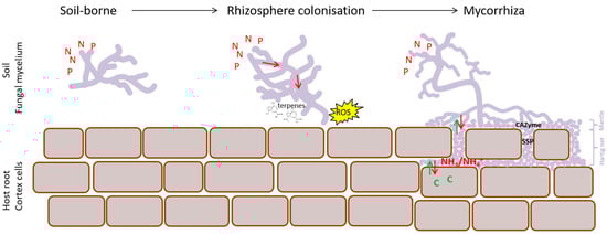 - Casieri, L.; Lahmidi, N.A.; Doidy, J.; Veneault-Fourrey, C.; Migeon, A.; Bonneau, L.; Courty, P.-E.; Garcia, K.; Charbonnier, M.; Delteil, A.; et al. Biotrophic transportome in mutualistic plant–fungal interactions. Mycorrhiza 2013, 23, 597–625. [Google Scholar] [CrossRef] [PubMed]