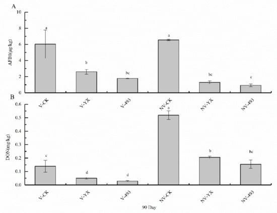 4.5. Effect of Two LAB Inoculants and V Treatment on AFB1 and DON Contents of Alfalfa Silage