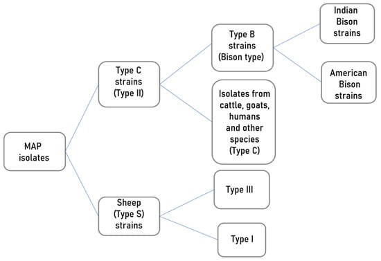 Principally, three broad MAP strain groups are recognised depending on their growth characteristics, colony pigmentation and host associations: Sheep type or “Type S”, the Cattle type or “Type C” and the Bison or “B-type” []. Some of the molecular techniques used in MAP strain typing for identification of genetic diversity include: IS900 restriction fragment length polymorphism (RFLP) [], IS1311 RFLP, IS1311 polymerase chain reaction–restriction enzyme analysis (PCR-REA) [], pulsed-field gel electrophoresis (PFGE) []; short sequence repeat (SSR) [], mycobacterial interspersed repetitive unit-variable number tandem repeat (MIRU-VNTR) analysis [] and single-nucleotide polymorphism (SNP) typing []. These typing techniques have divided MAP into Type I, II and III (Figure 1). Type I is predominantly isolated from sheep (Type S) and Type II is for isolates from cattle and other animals as well as humans. Type III is a subgroup of Type S. Based on SNP analysis of the IS1311, MAP first isolated from bison from Montana, USA, has been classified as Type B []. With further molecular analysis, this bison type was found to differ from a similar type from India giving rise to the Indian bison type []. Type B strains are a subtype of Type C but are not restricted to the bison. Type III and Type I appear to be subgroups of Sheep type []. Recent studies recommend that MAP characterisation should be based on whole genome sequence (WGS) analysis of genetic markers such as insertion elements, repetitive sequences and single nucleotide polymorphisms (SNP) [,] for better resolution, although this would be very expensive for small epidemiological studies.