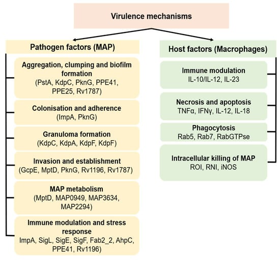 MAP has been shown to undergo significant genetic modifications during host–pathogen interaction within macrophages. One such modification is iron limitation, which triggers nitric oxide build-up linked to nitric oxide synthase production, which prompts MAP to enter into an iron sequestration program. This kind of pathway is likely to contribute to MAP virulence by aiding MAP establishment and long-term survival within host macrophages []. However, it is not known how MAP influences the host metabolic state for its benefit and whether the genetic factors contributing to MAP virulence are also involved in these processes. To date, only a couple of genes have been shown to modulate MAP virulence within macrophages (Figure 2).