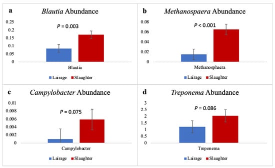 Relative bacterial abundances of: (a) Blautia, (b) Methanosphaera, (c) Campylobacter, and (d) Treponema in the rumen of Angus steers (n = 17) before (lairage) and after (slaughter) 16 h pre-slaughter fasting occurred. Error bars indicate the standard error of the mean. p-values indicate the difference between bacterial abundance from lairage to slaughter.
