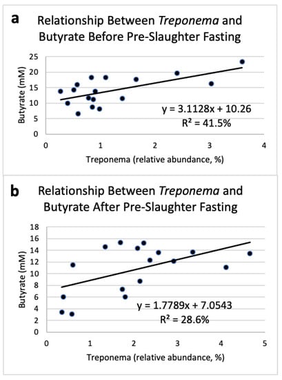 Linear regression expressing the relationship between Treponema relative abundance and butyrate concentration prior to pre-slaughter fasting (a) and after 16 h of pre-slaughter fasting (b) in the rumen of Angus steers (n = 17).