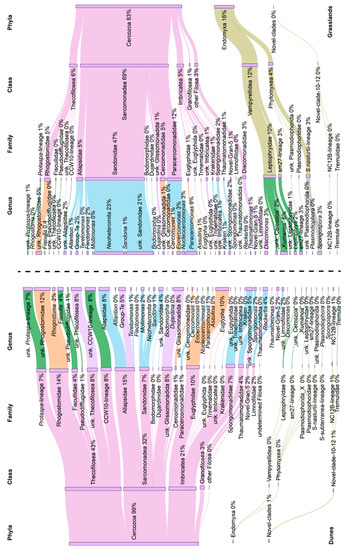 - Fiore-Donno, A.M.; Richter-Heitmann, T.; Bonkowski, M. Contrasting responses of protistan plant parasites and phagotrophs to ecosystems, land management and soil properties. Front. Microbiol. 2020, 11, 1823. [Google Scholar] [CrossRef] [PubMed]