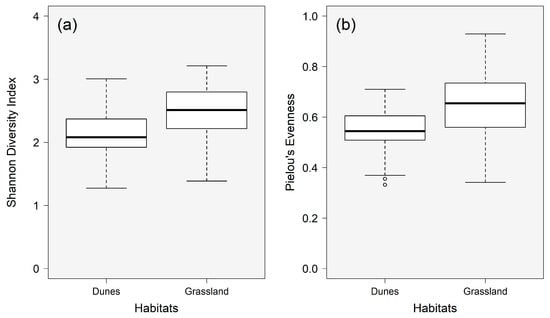 (a) Shannon diversity index and (b) Pielou’s evenness of cercozoan and endomyxan communities in biocrusts from coastal dunes (Germany) and subarctic grassland (Iceland) (significant differences between habitats, p = 0.03 and p = 0.02 for Shannon index and evenness, respectively). Individual points outside quartiles are plotted as outliers of the data.