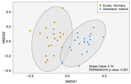 Non-metric multidimensional scaling (NMDS) based on Bray–Curtis dissimilarities among 40 biocrust samples from temperate coastal dunes (Germany) and subarctic grassland (Iceland).