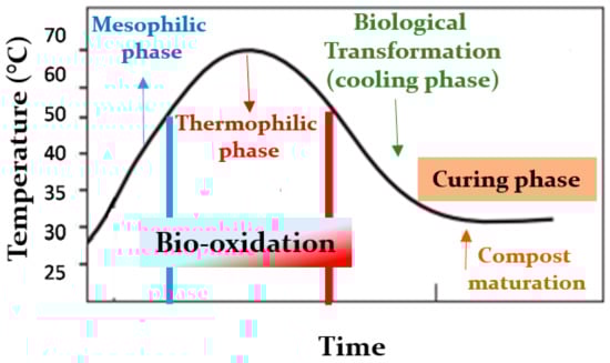 The composting process is characterized by four phases: (1) the initial mesophilic phase (10–42 °C), during which, the temperature rapidly rises and initiates organic matter decomposition; (2) the thermophilic phase (45–70 °C), which is distinguished by prolonged high temperatures due to the extensive metabolic activities undertaken by endogenous microorganisms; (3) the middle mesophilic phase (65–50 °C), during which, the temperature decreases, allowing for re-establishment of the heat-resistant microbes; (4) the finishing phase (50–23 °C), during which, the organic matter and biological heat production stabilize [2]. Moreover, it is carried out by different classes of microbes, such as mesophiles and thermophiles. Generally, mesophilic microorganisms, which function best between 30 and 50 °C, initiate the composting process. As microbial activity increases soon after compost piles are formed, temperatures and density within the piles also increase and thermophilic microorganisms take over at temperatures above 50 °C. The temperature in the compost pile typically increases rapidly from 50 to 70 °C within 24 to 72 h of the pile formation and can stay there for several days depending on feedstock properties, pile size, and environmental conditions. This represents the “active phase” of composting, during which, decomposition is the most rapid. It continues until the materials containing nutrients and energy within the piles have been transformed. As the microbial activity decreases, the pile compost temperature gradually declines to approximately 37 °C. Mesophilic microorganisms recolonize the pile, and the compost enters the “curing phase.” The oxygen consumption during curing declines and organic materials continue to decompose and are converted to biologically stable humic substances that represent the mature or finished compost. Potentially toxic organic acids and resistant compounds are also stabilized during curing. A long curing phase is needed if the compost is unfinished or immature, which is possible if the compost pile contained too little oxygen or either too little or too much moisture [2] (Figure 1).