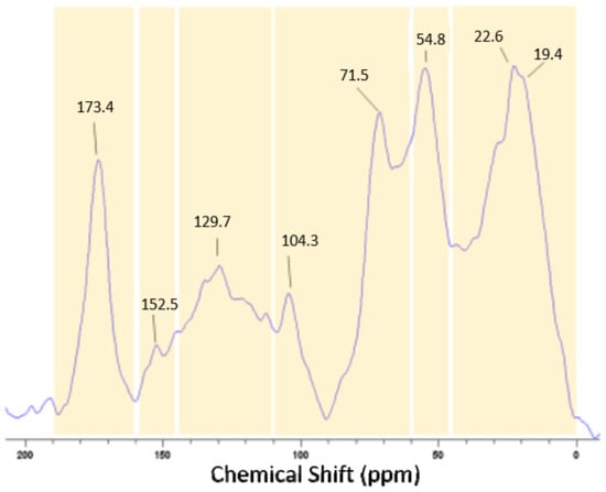 A 300 MHz Bruker Avance spectrometer (Bruker Italia, Milan, Italy), equipped with a 4 mm wide-bore MAS probe, was used for solid-state analyses of the compost. A fine-powdered compost sample (250 mg) was packed into a 4 mm zirconium rotor, which was provided with a Kel-F cap, and spun at a rate of 13,000 ± 1 Hz. The 13C-NMR spectrum was acquired through a cross-polarization magic-angle spinning (CPMAS) technique by using 2 s of recycling delay, 1 ms of contact time, 30 ms of acquisition time, and 4000 scans. Chemical shift regions were assigned according to Cozzolino et al. [16]. The area of each region was determined by integration using the MestreNova 6.2.0 software (Mestrelab Research, S.L., Santiago de Compostela, Spain) and expressed as a percentage of the total area.