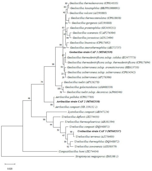 For the DNA analysis, the cells of strains CAF2, CAF5, and CAF1 were collected after 24 h of incubation at a temperature of 60 °C via centrifugation at 5000× g for 15 min. Genomic DNA was isolated using DNAzol (Molecular Research Center, Inc., Cincinnati, OH, USA) according to the manufacturer’s instructions. Polymerase chain reaction (PCR) amplification and sequencing of the almost full-length 16S rRNA genes of three strains were obtained from the genomic DNA amplification by using universal primers 8F and 1517R with a broad specificity into a PCR. The nucleotide sequences of 16S rRNA genes were analyzed using the EzTaxon-e server (https://www.ezbiocloud.net) and the values for the pairwise 16S rRNA gene sequence similarities between the closest species were determined using the EzTaxon-e server. The phylogenetic tree was reconstructed by using the software package MEGA X (version 10.1 https://www.megasoftware.net/show_eua) after multiple alignments of the data using CLUSTAL_X [20]. The evolutionary history was inferred by using the maximum likelihood method and the Tamura 3-parameter model [21]. The percentage of trees in which the associated taxa clustered together is shown next to the branches. The initial tree(s) for the heuristic search were obtained automatically by applying the neighbor-joining and BioNJ algorithms to a matrix of pairwise distances that were estimated using the maximum composite likelihood (MCL) approach and then selecting the topology with the superior log-likelihood value.