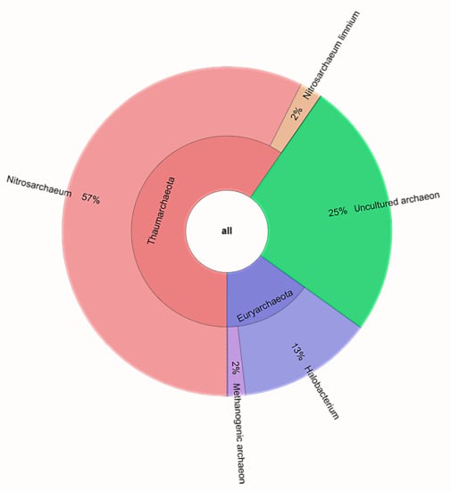 Of the total high-quality archaeal sequences, about 25% were not classified at the genus level. A total of six genera were resolved from the rest (Table 4). The retrieved Thaumarchaeota almost all referred to the genus Nitrosarchaeum (60.9%), with 2% of them being related to Nitrosarchaeum limnium. Euryarchaeota were represented by a higher number of genera, mainly Halobacterium (13.2%) and methanogens (1.7%).