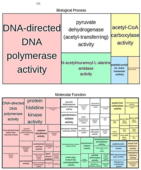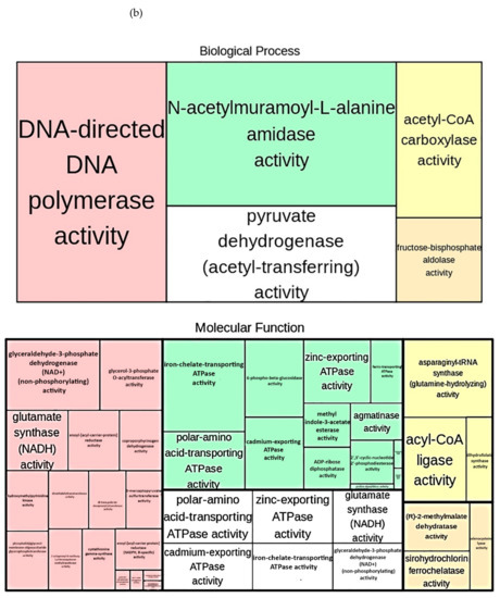 Molecular functions were completely different in general and specific terms. In the specific category, we were able to find both anabolic and catabolic molecular functions that were involved in different metabolic processes. Most of the retrieved processes were related to the cell wall and peptidoglycan degradation (in particular, phosphatidylglycerol-membrane-oligosaccharide glycerophosphotransferase activity, glycerol-3-phosphate O-acyltransferase activity, and glyceraldehyde-3-phosphate dehydrogenase (NAD+) (non-phosphorylating) activity), which showed an abundance of 11.1% of the total retrieved functions. Specific functionalities related to the metal ion transport, iron import into the cell, and iron-binding and amidase activity were also predicted (in particular, iron-chelate-transporting ATPase activity, cadmium-exporting ATPase activity, zinc-exporting ATPase activity, ferric-transporting ATPase activity, iron-chelate-transporting ATPase activity, zinc-exporting ATPase activity, cadmium-exporting ATPase activity, methyl indole-3-acetate esterase activity, indoleacetamide hydrolase activity, and nicotinamide-nucleotide amidase activity), representing 27.05%. The results are graphically summarized in a tree map (Figure 5).
