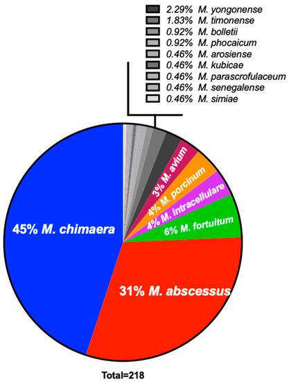 - Huang, W.C.; Chiou, C.S.; Chen, J.H.; Shen, G.H. Molecular epidemiology of Mycobacterium abscessus infections in a subtropical chronic ventilatory setting. J. Med. Microbiol. 2010, 59, 1203–1211. [Google Scholar] [CrossRef] [PubMed][Green Version]