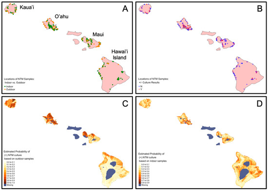 Outdoor and indoor collection site locations and their stratification by NTM culture results are shown in Figure 2A,B. Machine learning tools were subsequently applied to associate NTM culture status with geospatial variables in predictive models. The predictive models were then applied to 1 km2 grid of points across the islands to develop risk maps of positive NTM culture for outdoor and indoor samples. The risk map showing the probability of finding NTM in outdoor locations is shown in Figure 2C and the risk map showing the probability of finding NTM in indoor locations is shown in Figure 2D. The positive predictive accuracy of the outdoor model was 0.70 with a Cohen’s kappa value of 0.23. The positive predictive accuracy of the indoor model was lower at 0.56 with a Cohen’s kappa of 0.1, suggesting that the outdoor model predicts where a positive culture would occur 70% of the time relative to the 50% associated with random chance.