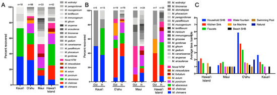 Of the NTM identified, indoor water biofilms including those collected from household showerheads, kitchen sinks, and bathroom faucets were common niches for NTM, particularly on O’ahu, with an average of six, four, and three NTM species identified in these respective sample types (Figure 3C). Of the eight types of different water biofilm samples collected (i.e., household showerheads, kitchen sinks, bathroom faucets, water fountains, ice machines, beach showerheads, swimming pools, and natural sites), NTM were recovered from all eight types on O’ahu and varied in recovery among the other island samples.