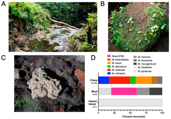 Natural areas of Hawai’i do not harbor significant NTM. (A) Representative image of freshwater streams that were sampled for NTM. In these locations, large rocks or boulders lodged in the freshwater stream were sampled at the air-water interface. (B) Representative image of moss that were typically located growing on the surface of large boulders. (C) Representative image of lava rocks sampled. Swabs were wiped across the surface of rocks and in cervices although these surfaces were devoid of NTM. (D) Diversity of NTM species recovered from stream-rock interface biofilms and moss from O’ahu, Maui, and Hawai’i Island.