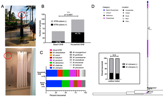Indoor household SHB are known niches for environmental NTM [8,24,25]; however, the prevalence of NTM in outdoor SHB is not known. In Hawai’i, outdoor freshwater showers are commonplace and associated with public beaches (Figure 5A). To investigate NTM diversity among the different Hawai’i showerheads, we compared NTM recovery from beach and household SHB. Significantly less NTM were recovered from beach SHB (8/61, 13.1%) compared to household SHB (55/123, 44.7%) (Figure 5B). M. abscessus and M. porcinum were identified from both types of SHB. M. chelonae and M. avium were repeatedly recovered from household SHB, but were absent from beach SHB; whereas M. intracellulare was only recovered from beach SHB. M. chimaera was the most frequently identified NTM from both outdoor and indoor showerheads (Figure 5C); however, it was recovered in equal proportions from either type of SHB (Figure 5D, inset graph). Phylogenetic analyses indicate that in Hawai’i, patients may have equal opportunities to acquire M. chimaera from either outdoor and indoor SHB. This is because rpoB gene comparisons showed genetically similar M. chimaera colonizing both beach and indoor SHB as respiratory M. chimaera isolates (Figure 5D).