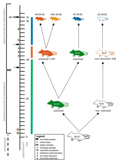 Graphic design of the experiment. The experiment involved three phases in which rats were affected by several factors: worm colonization (green bar; Days 1–20, but the H. diminuta colonization persisted throughout the experiment in the colonized rats), gut microbiota disruption (red bar; Days 21–24), and intestinal inflammation (blue bar; Days 25–31). The main monitoring and sample collection were performed on Day 31 (for more information see Material and Methods). There were four differently affected groups of rats: (i) treated with helminth and antibiotics (HA; red rat, N = 8); (ii) treated with helminth, antibiotics, and colitis (HAC; yellow rat, N = 8); (iii) treated with helminth and colitis (HC; blue rat, N = 8); (iv) treated with antibiotics and colitis (AC; white rat, N = 8). To evaluate the ongoing changes in the microbiota, fecal samples were collected throughout the experiment—on Days 0, 18, 25, and 31 (i.e., after colonization, after antibiotics administration, and after colitis induction). ATB—antibiotics.