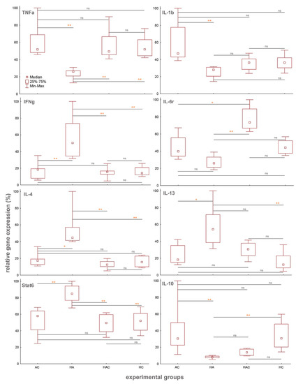 Changes in the relative gene expressions of all the monitored pro-inflammatory and anti-inflammatory markers (TNFα, IL-1β, IFNγ, IL-6r, IL-4, IL-13, Stat6, and IL-10) in the spleen samples. All cytokines were measured in all experimental groups of rats (AC, HA, HAC, and HC) on Day 31. All gene expressions are relative to the UBC housekeeping gene. Differences in the expressions of the genes among individual experimental groups were assessed by non-parametric Kruskal–Wallis ANOVA with multiple comparisons. ns—not significant; *—p < 0.05; **—p < 0.01.