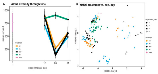 Microbial analyses throughout the experiment in rat fecal samples—after colonization (Day 18), after antibiotic treatment (Day 24) and after colitis treatment (Day 31). (A) Changes in the alpha diversity in the groups throughout the experiment; (B) NMDS analyses of the compositional changes in gut microbiota throughout the experiment, comparing treatment (in color) versus experimental day (in shape). For more details about the experimental groups and treatments, see Figure 1 or Supplementary Data S1.