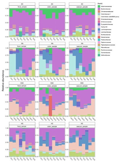 The proportions of various bacterial taxa present in the rat intestine differed significantly between all groups on Day 31 (Figure 5): (i) group AC—Akkermansiaceae and Bacteroidaceae taxa predominated; (ii) group HAC—a similar trend as the previous group, with the additional predominant taxon Muribaculaceae; (iii) group HC—significant proportions of Lachnospiraceae and Muribaculaceae taxa; and (iv) group HA—the application of antibiotics evidently enhanced the cage effect on the taxonomic composition of intestinal microbiota as the cage mates were always more similar to each other than to the other individuals in their group (for HA1 and HA2 Rikenellaceae predominated; for HA3 and HA4 Lachnospiracea predominated; in the other two cage mate pairs there was a large proportion of Bacteroidaceae, with HA7 and HA8 additionally having a significant proportion of Muribaculacea). We confirmed the trends in taxonomic representation in each group using three types of samples—fecal, colon, and cecum. All sequence data and MiMARKs compliant metadata for this study are available at the European Bioinformatics Institute (accessions PRJEB35048/ERP118040).