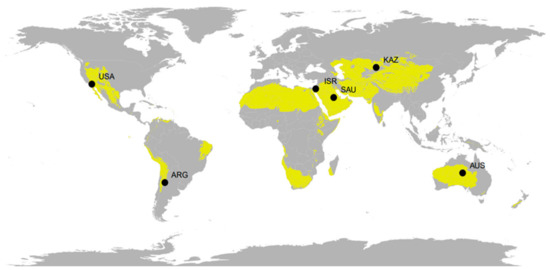 Sampling locations and desert and arid shrubland biomes colored yellow.
