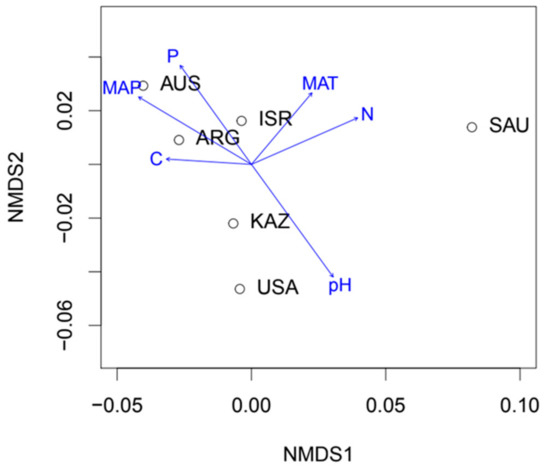 Study site characteristics. Mean annual temperature (MAT), mean annual precipitation (MAP), soil organic carbon (C), total nitrogen (N), available phosphorus (P), Argentina (ARG), Australia (AUS), Israel (ISR), Kazakhstan (KAZ), Saudi Arabia (SAU) and United States of America (USA). Ecoregion is from [36].