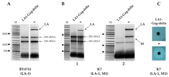 The impact of LA1-Gag-delta overexpression on the maintenance of LA and M dsRNAs. (A) Agarose gel electrophoresis of total RNA isolated from the BY4741 strain; LA1-Gag-delta is the sample of the strain transformed by truncated LA‑1 Gag protein expression vector, − is the control sample. (B) Agarose gel electrophoresis of total RNA (1) and dsRNA (2) isolated from K7 strain transformants. (C) Killer phenotype assay of K7 yeast strain transformant. M column is the molecular size marker (GeneRuler DNA Ladder Mix, Thermo Scientific, Vilnius, Lithuania); yeast strains with corresponding genotypes are indicated below the pictures.