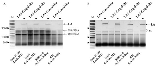 Removal of LA-1 dsRNA also occurred in the K1 killer strain K7 (LA-1, M1), as demonstrated in Figure 1B, and was followed by the loss of the killer phenotype, as shown in Figure 1C. In order to address the specificity of the LA-1 exclusion, LA1-Gag-delta was introduced into the wild-type killer strains Rom K-100 (LA-2, M2), SRB-15-4 (LA-lus, Mlus), M437 (LA-lus, M2) and K28 (LA-28, M28). Electrophoretic analysis of total RNA and dsRNA fractions (Figure 2A,B) demonstrated the loss of the corresponding LA dsRNA fraction altogether with M dsRNA, indicating virtually complete clearance of all employed strains from the viral dsRNA genomes. The elimination of LA viruses from BY4741, K7 and M437 strains was verified using RT-PCR (Figure S2) and further confirmed by analysis of killer sensitivity of the resulting strains; expression of LA1-Gag-delta resulted in a loss of killing capacity for all killer strains (not shown).