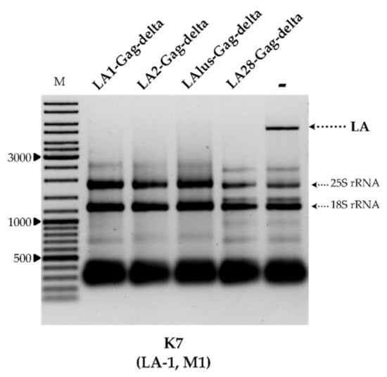 The impact of overexpression of truncated LA-1, LA-2, LA-lus and LA-28 Gag proteins on the maintenance of LA dsRNA in the K7 strain. Agarose gel electrophoresis of total RNA isolated from respective yeast transformants: LA1/LA2/LAlus/LA28-Gag-delta refers to samples transformed by truncated LA Gag protein expression vectors, − denotes the control sample. M column is molecular size marker (GeneRuler DNA Ladder Mix, Thermo Scientific, Vilnius, Lithuania); yeast strain with corresponding genotype is indicated below the picture.