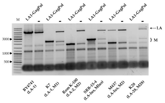 The impact of overexpression of LA-1 capsid proteins on the maintenance of LA and M dsRNAs in BY4741, K7, Rom K-100, SRB-15-4, M437 and K28 strains. Agarose gel electrophoresis of dsRNA isolated from respective yeast strain transformants; LA1-GagPol refers to samples transformed with LA-1 proteins expression vector, − denotes control samples. M column is molecular size marker (GeneRuler DNA Ladder Mix, Thermo Scientific, Vilnius, Lithuania); yeast strains with corresponding genotypes are indicated below the pictures.