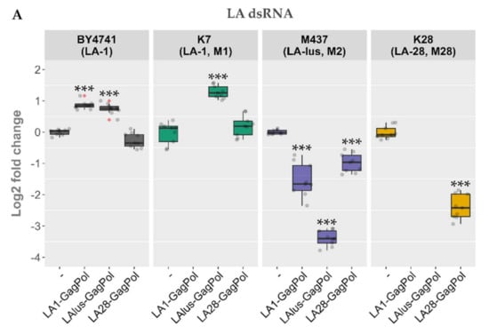 The role of M1 dsRNA in maintenance of the LA-1 virus following the overexpression of LA1-GagPol and LAlus-GagPol proteins. Relative change in the amount of LA dsRNA compared to control samples is depicted (-). Examined yeast strains are specified at the top; protein expression vectors are listed below. Gray dots correspond to individual samples. Statistical significance was evaluated using Student’s t-test. P values below 0.05 were considered statistically significant (*** p < 0.001).