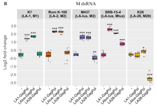 Following the same scheme, the expression plasmids bearing LA-lus and LA-28 complete coding sequences were prepared and were used to transform the BY4741 along with killer strains K7, Rom K-100, M437, SRB-15-4 and K28. LA dsRNA was quantified from the total nucleic acid preparation (Figure 5A), whereas the dsRNA fraction was used for M dsRNA quantification for a more precise analysis of dsRNA maintenance (Figure 5B). Three samples from three separate colonies (nine samples for every transformed strain) were used to obtain the nucleic acid preparations and were resolved in agarose gel. Amounts of viral dsRNA were quantified by densitometric analysis and normalized with respect to 18S rRNA. The expression of GagPols from different LA viruses in the BY4741 strain resulted in a different outcome as compared to the killer strains. The amount of LA-1 dsRNA in BY4741 was either increased (for LA1-GagPol and LAlus-GagPol expression) or remained at the same level (LA28-GagPol) (Figure 5A). For killer strains, occasional exclusion of parental LA dsRNA was observed: K7 strain lost LA-1 following the expression of LA1-GagPol, K28 lost LA-28 following the expression of LA1-GagPol or LAlus-GagPol. For other combinations, the trend towards diminishing the amount of the parental LA dsRNA was observed; the only exception was the K7 strain, of which the LA-1 dsRNA level was boosted 2.45-fold by the expression of LAlus-GagPol. Of note, Rom K-100 and SRB-15-4 strains lost inherent LA completely under the expression of any of the employed GagPols—encoded by either LA-1, LA-lus or LA-28—and therefore are omitted from Figure 5A.