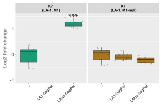 and Figure S3). Moreover, in the K7 M1-null strain the level of LA-1 dsRNA did not increase upon the expression of LAlus-GagPol, in sharp contrast to a 2.45-fold increase seen in the wild-type K7 strain. Strikingly, the expression of this construct in the K7 M1-null strain had virtually the same effect as the expression of LA1-GagPol or the presence of the empty expression vector (Figure 6).