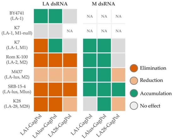 To investigate the compatibility of inherent dsRNA viruses with heterologous virions, we expressed the full-length GagPol ORFs encoded by LA-1, LA-lus and LA-28 viruses. As established for the LA-1 virus, ribosomal frameshift frequency ensures translation of ~98% of Gag and the remaining ~2% of the fusion GagPol protein [38]. This system allows investigation of the impact of heterologous native virions, providing the transcription and replication-competent environment for both LA and M viruses, addressed in both laboratory and wild-type strains. We observed the general trend for incompatibility of heterologous virions toward inherent LA dsRNA and the opposite—supporting—effect for a M dsRNA (Figure 7). The effects of GagPols from LA-1 and LA-lus on the maintenance of inherent Totiviridae viruses were essentially overlapping; notable exceptions are the accumulation of LA-1 dsRNA in the K7 strain, transformed by the LAlus-GagPol expressing plasmid, and the minute change in the amount of M28 dsRNA in the K28 strain, transformed by the LA1-GagPol plasmid. In this context, LA28-GagPol triggers no effect on the presence of LA-1 dsRNA in the K7 strain and the reduction in the LA-28 dsRNA amount in the K28 strain. In strains transformed by the LA28-GagPol plasmid, the accumulation of M dsRNA is found in the SRB-15-4 strain only, with no effect on K7 and Rom K-100 strains and a reduction in the amount observed in M437 and K28 strains. Here, we likely encounter specificity-driven virus cross-fitting. As demonstrated, LA-lus dsRNA present in the M437 strain is generally more resilient to exclusion by any of the GagPols expressed in this strain, including its own LAlus-GagPol. We attribute this effect to the “hybrid” combination of LA-lus and M2 dsRNA in the M437 strain, making virus relations shifted from the general fitting context. The differing sensitivity of LA-1 dsRNA in the K7 strain toward LA-1 and LA-lus GagPols expressed in trans attracted our attention and was explored further, see below for discussion. Although the maintenance of LA-28 dsRNA in the K28 strain generally follows an exclusion trend (except in case of LA28-GagPol overexpression), the amount of M28 dsRNA is either affected insignificantly (LA1 and LAlus GagPol overexpression) or reduced (LA28-GagPol overexpression). We attribute the difference in M28 dsRNA maintenance to species origin—K28 was found to be Saccharomyces paradoxus, not the S. cerevisiae [20,32]. Therefore, GagPols originating from different viruses appear to display particular specificity in excluding LA viruses and maintaining M viruses. This observation needs to be further verified by the analysis of new Saccharomyces killer systems, identified by next-generation sequencing [32,33].