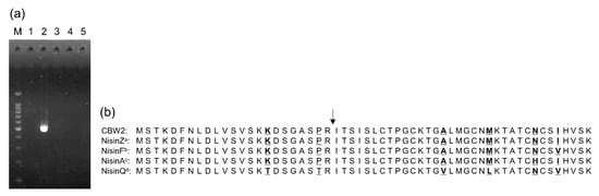 We obtained an amplicon only from strain CBW2, the size of which was similar to that found in a previous study [43], using the precursor nisin structural gene (nisA) primer set (Figure 3a). Fifty-seven amino acid residues (MSTKDFNLDLVSVSKKDSGASPRITSISLCTPGCKTGALMGCNMKTATCNCSIHVSK) in the DNA amplicon were deduced, and the predicted RiPP class was lanthipeptideA with a leader peptide (MSTKDFNLDLVSVSKKDSGASPR) and core peptide (ITSISLCTPGCKTGALMGCNMKTATCNCSIHVSK). The amino acid sequences of the nisin prepeptides highlighted that the deduced amino acid sequence from strain CBW2 was 100% coincident with that of nisin Z (Figure 3b). We also obtained amplicons only from strain CBW2 using each primer set targeting nisB, nisC, nisT, nisP, nisF, nisI, and nisRK, and their amplicons were the expected sizes based on a previous study [52] (Table 7, Figure S4).