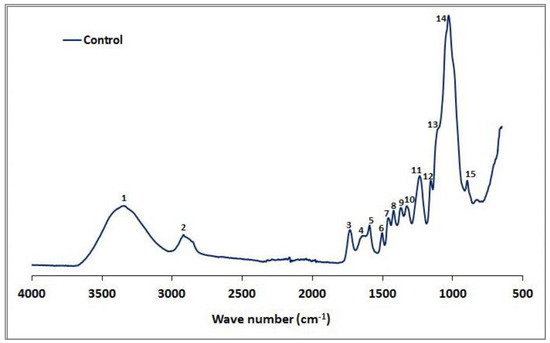 The FTIR spectra of the control beech sample are shown in Figure 1, and potential linkages in the spectra are described (Table 2). However, our results differed from those found in previous studies (e.g., Pandey and Pitman [57]). The high xylan content in hardwoods such as beech produced a strong carbonyl band at 1732 cm−1 (3), and the bands at 1318 cm−1 (10) and 1233 cm−1 (11) reflect the C1-O vibration in syringyl derivatives (Table 3).