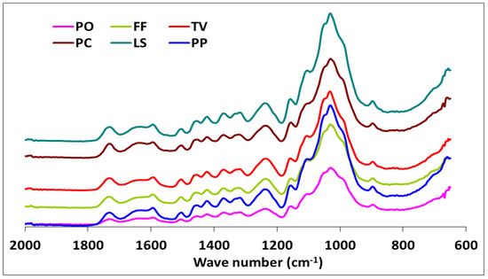 The comparison FTIR spectra of beech wood exposed to Pleurotus ostreatus (PO), Trametes versicolor (TV), Lentinus sajor-caju (LS), Pleurotus pilmonarius (PP), Fomes Fomentarius (FF), and Phanerochaete chrysosporium (PC).