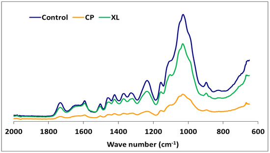 The comparison FTIR spectra of beech wood with or without exposure to Xylaria longipes (XL) or Coniophora puteana (CP).