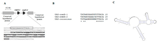 We identified a fourth Rsm sRNA by performing a BLAST search against the P. brassicacearum NFM421 genome and using the upstream activating sequence (UAS; TATAGCGAAACGCTTACA) recognized by GacA as query sequence. This revealed an additional UAS located upstream the gene encoding a putative sRNA (Figure 1A), which shares 75% similarity with rsmX gene, while the UAS sequence is almost identical (Figure 1B). We renamed RsmX to RsmX-1, and the novel Rsm sRNA was named RsmX-2. The secondary structure of RsmX-2 was predicted with RNAfold and visualized using vaRNA software [31]. At least three potentially mimicked recognition motifs of RsmA/E (i.e., ANGGA or AGGA motifs) [32], are exposed within a hairpin loop, suggesting that RsmX-2 could sequester these proteins (Figure 1C).