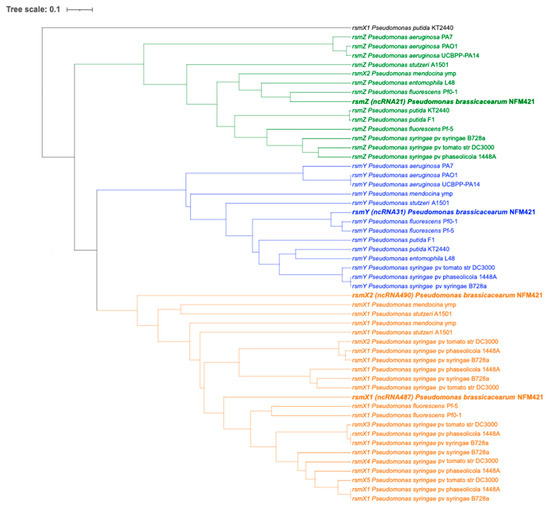 Phylogenetic analysis of rsm RNA sequences. rsm genes from P. brassicacearum NFM 421 are shown in bold.
