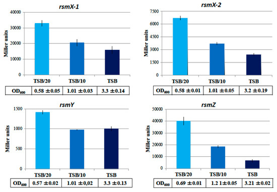 Cultures containing a rsmX-2 + 16-lacZ construct were grown overnight, diluted 1:200 into 8 mL of TSB with tetracycline (20 µg/mL), and grown over a period of 24 h. For the time-course of rsmX-2 expression, 50 mL cultures were sampled at different times and assayed immediately. β-galactosidase activities were quantified as previously described [18]. Experiments were conducted in triplicates.