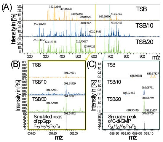 Signal molecules analysis. (A) Full ICR-FT/mass spectra of the wild type (WT) grown in TSB, tenfold dilutes TSB (TSB/10) and twenty-fold diluted TSB (TSB/20). (B,C) detection of (p)ppGpp and c-di-GMP compounds as annotated using metabolome database (MassTRIX: Suhre and Schmitt-Kopplin, 2008).