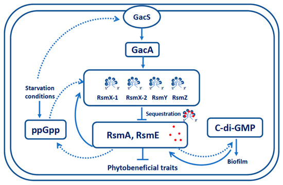 The wide distribution of the Csr/Rsm regulatory system in Eubacteria, including animal/plant pathogenic species as well as plant growth-promoting rhizobacteria (PGPR), illustrates that this well-conserved system is involved in various essential functions [10,11]. Indeed, small RNAs positively controlled by either the BarA/UvrY or GacS/GacA two-component systems have been shown to regulate various functions by coordinating the expression of a set of target genes post-transcriptionally [12,13]